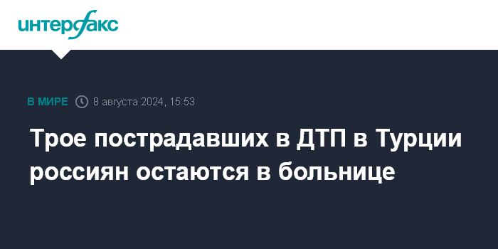 Москва. 8 августа. INTERFAX.RU - Трое из семи пострадавших в ДТП в Турции российских туристов остаются в больнице, сообщила "Интерфаксу" замгенерального директора страховой компании "Евроинс" Юлия Алчеева.