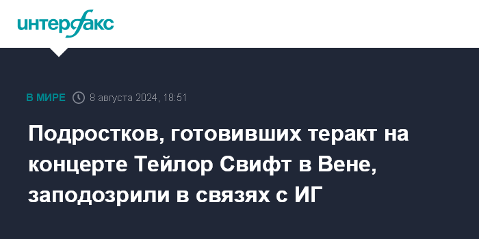 Москва. 8 августа. INTERFAX.RU - Задержанные полицией подростки, которые подозреваются в планировании теракта во время концерта популярной американской певицы Тейлор Свифт в Вене, могли быть связаны с террористической группировкой ИГ (запрещена в РФ). Об этом сообщает в четверг Sky News со ссылкой на данные австрийских следователей.