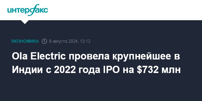 Москва. 9 августа. INTERFAX.RU - Индийский производитель электрических скутеров Ola Electric Mobility провел IPO на сумму 61,46 млрд индийских рупий ($732 млн), получив оценку в $4 млрд. Объем размещения стал крупнейшим в стране с момента IPO Life Insurance Corp. of India в 2022 году.