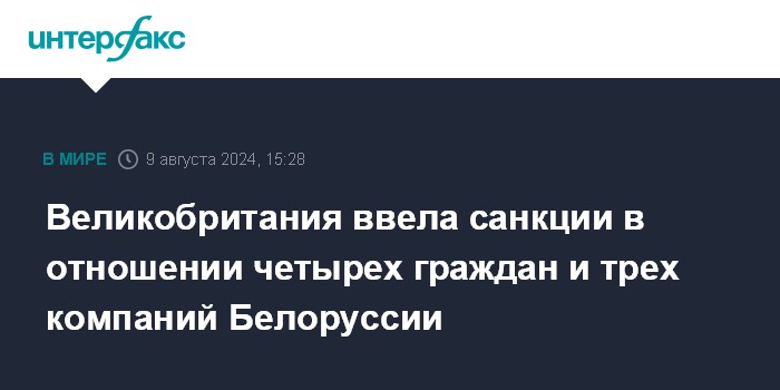 Москва. 9 августа. INTERFAX.RU - Великобритания ввела санкции против четырех физических и трех юридических лиц из Белоруссии, сообщил сайт британского правительства. Введение санкций приурочено к годовщине президентских выборов 2020 года, а также в связи с тем, что Белоруссия поддерживает российскую СВО на Украине.