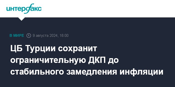 Москва. 9 августа. INTERFAX.RU - Центральный банк Турции будет сохранять ограничительную денежно-кредитную политику (ДКП) до тех пор, пока не увидит стабильного замедления инфляции, и воздержится от преждевременного снижения процентных ставок, заявил глава ЦБ Фатих Карахан.