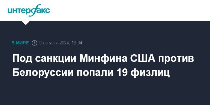 Москва. 9 августа. INTERFAX.RU - Власти США добавили 19 физлиц и 14 белорусских компаний в санкционные списки за поддержку российских действий на Украине, сообщил американский Минфин.