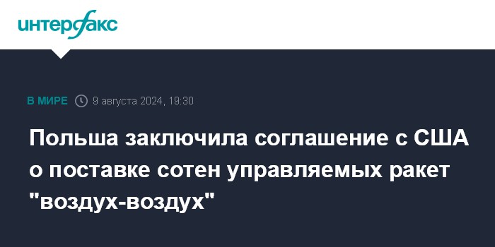 Москва. 9 августа. INTERFAX.RU - Польша подписала соглашение на поставку из США крупной партии управляемых ракет класса "воздух-воздух" средней дальности, сообщило в пятницу Агентство вооружений Польши.