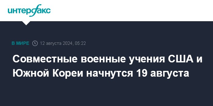 Москва. 12 августа. INTERFAX.RU - Южная Корея и США проведут совместные военные учения на следующей неделе, сообщает агентство "Ренхап" со ссылкой на Объединенный комитет начальников штабов ВС Южной Кореи (JCS).