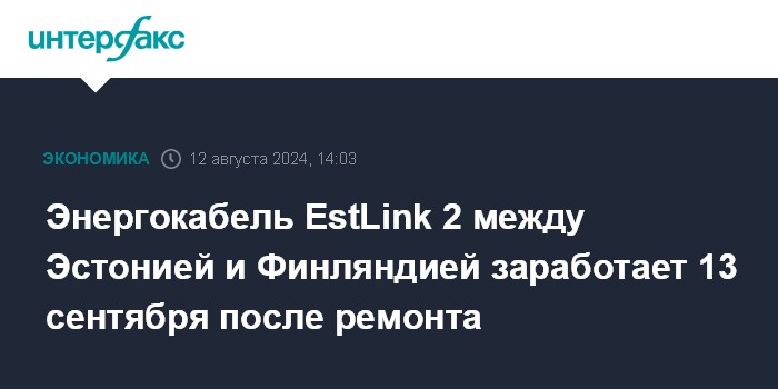 Москва. 12 августа. INTERFAX.RU - Ремонт подводного электрокабеля EstLink 2 между Эстонией и Финляндией, поврежденного в январе, завершится не позднее 12 сентября, с 13 сентября EstLink 2 начнет работу, сообщил эстонский оператор сетей электро- и газоснабжения Elering.