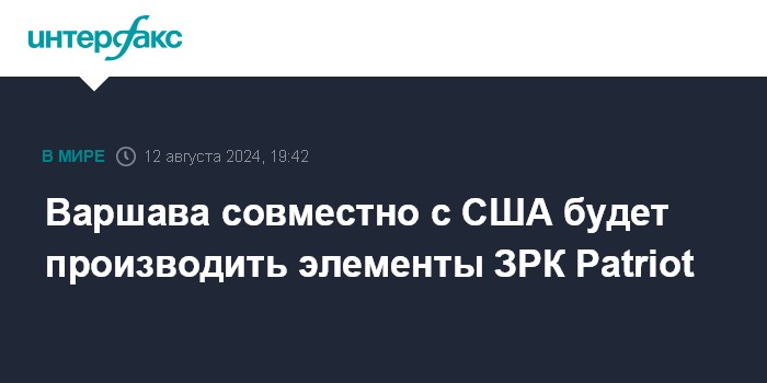 Москва. 12 августа. INTERFAX.RU - Польша в понедельник подписала соглашение с американским концерном Raytheon, касающееся совместного производства 48 пусковых установок ракет, которые являются частью ЗРК Patriot, информирует Польское радио.