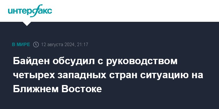 Москва. 12 августа. INTERFAX.RU - Американский президент Джо Байден в понедельник говорил по телефону с руководством Франции, Германии, Италии и Великобритании об обстановке на Ближнем Востоке и об усилиях по снижению напряженности, сообщил представитель Совета нацбезопасности США Шон Саветт.