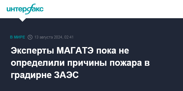 Москва. 13 августа. INTERFAX.RU - Эксперты Международного агентства по атомной энергии (МАГАТЭ) посетили Запорожскую атомную электростанцию (ЗАЭС) после пожара на градирне, но пока не смогли сделать окончательные выводы о причинах произошедшего.