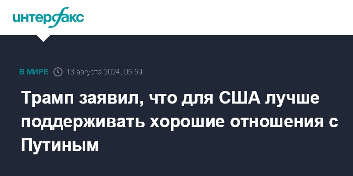 Москва. 13 августа. INTERFAX.RU - Кандидат в президенты США от республиканцев экс-глава Белого дома Дональд Трамп считает, что для Вашингтона лучше поддерживать хорошие отношения с такими мировыми лидерами как президент России Владимир Путин, председатель КНР Си Цзиньпин и глава КНДР Ким Чен Ын.