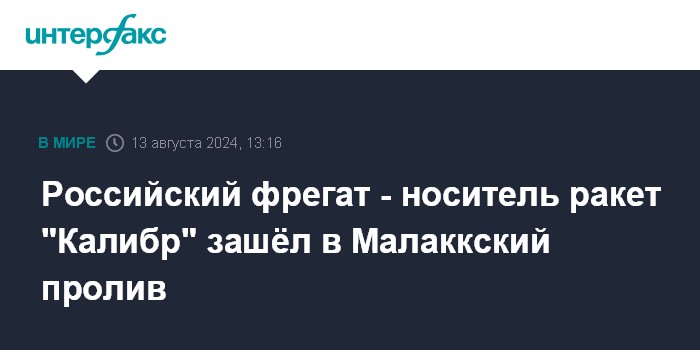 Москва. 13 августа. INTERFAX.RU - Отряд кораблей Тихоокеанского флота в составе ракетного крейсера "Варяг" и фрегата "Маршал Шапошников", оснащённого ракетами "Калибр", зашёл в Малаккский пролив, сообщила во вторник пресс-служба ТОФ.