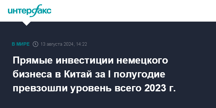 Прямые инвестиции немецкого бизнеса в Китай за I полугодие превзошли уровень всего 2023 г.