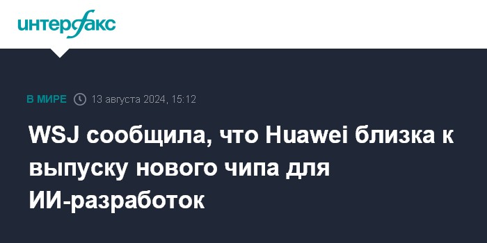 Москва. 13 августа. INTERFAX.RU - Китайская Huawei Technologies близка к выпуску нового чипа, предназначенного для использования в ИИ-разработках, пишет The Wall Street Journal.