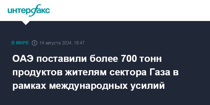 Москва. 14 августа. INTERFAX.RU - ОАЭ в рамках международных усилий по оказанию гуманитарной помощи жителям сектора Газа поставили более 700 тонн пищевых продуктов, сообщили в среду в департаменте стратегических коммуникаций МИД ОАЭ.