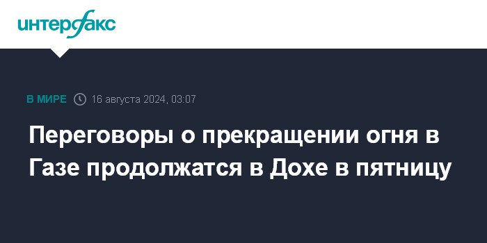 Москва. 16 августа. INTERFAX.RU - Посредники на переговорах по достижению соглашения о прекращении огня в секторе Газа продолжат работу в Дохе в пятницу, сообщили в министерстве иностранных дел Катара.