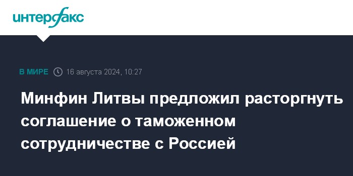 Москва. 16 августа. INTERFAX.RU - Министерство финансов Литвы предлагает расторгнуть соглашения о таможенном сотрудничестве, подписанные с Россией и Белоруссией почти три десятилетия назад.