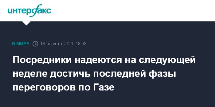 Москва. 16 августа. INTERFAX.RU - США, Египет и Катар, выступающие посредниками на переговорах о прекращении огня в секторе Газа, выразили надежду, что к концу следующей недели диалог перейдет на финальную стадию.