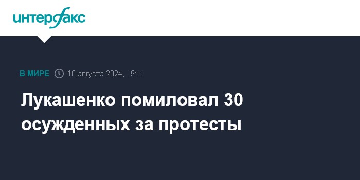 Москва. 16 августа. INTERFAX.RU - Президент Белоруссии Александр Лукашенко подписал в пятницу указ о помиловании 30 человек, осужденных за "преступления протестной направленности".