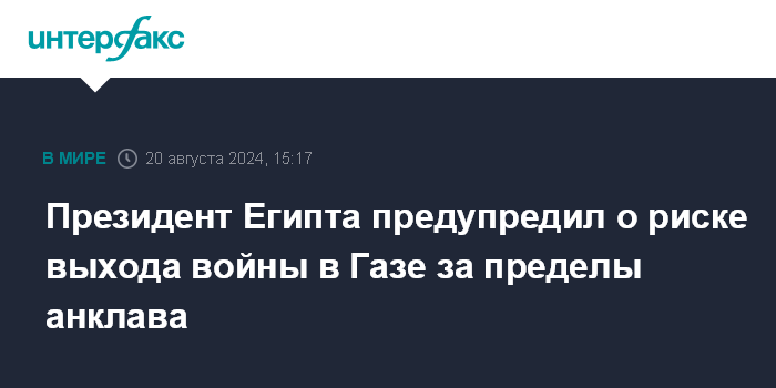Москва. 20 августа. INTERFAX.RU - Президент Египта Абдель Фаттах ас-Сиси на встрече с госсекретарем США Энтони Блинкеном во вторник выразил опасения по поводу возможного распространения конфликта в секторе Газа на весь ближневосточный регион, сообщает газета "Аш-Шарк аль-Аусат".