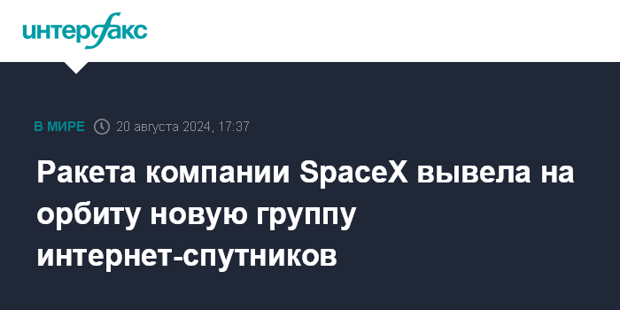 Москва. 20 августа. INTERFAX.RU - Ракета-носитель Falcon 9 во вторник успешно вывела на орбиту очередную партию из 22 мини-спутников для пополнения орбитальной группировки глобальной сети интернет-покрытия системы Starlink, сообщила компания-разработчик SpaceX.