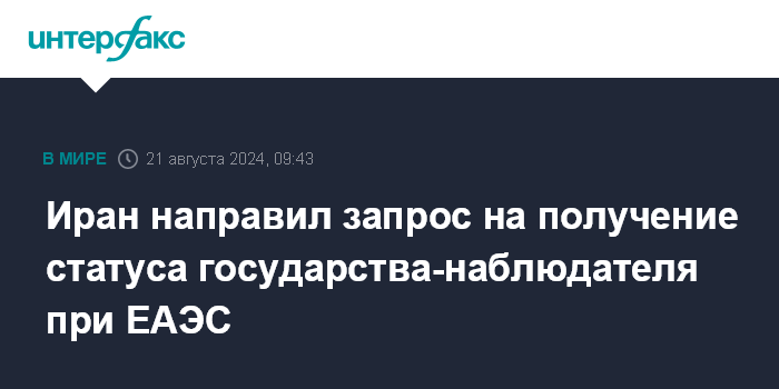 Москва. 21 августа. INTERFAX.RU - Иран направил запрос на получение статуса государства-наблюдателя при Евразийском экономическом союзе, сообщила пресс-служба Евразийской экономической комиссии.