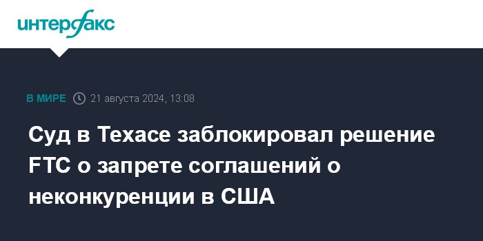 Москва. 21 августа. INTERFAX.RU - Суд в Техасе заблокировал решение Федеральной торговой комиссии США (FTC) о запрете соглашений о неконкуренции.