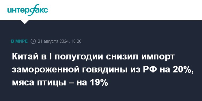 Китай в I полугодии снизил импорт замороженной говядины из РФ на 20%, мяса птицы – на 19%