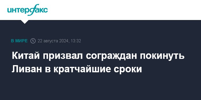 Москва. 22 августа. INTERFAX.RU - Пекин призвал граждан Китая, которые находятся в Ливане, в ближайшее время покинуть эту страну из-за напряженности на ливанско-израильской границе, сообщают западные СМИ со ссылкой на заявление посольства КНР в Бейруте.