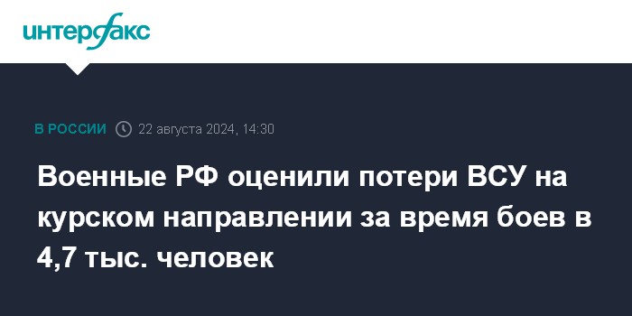 Москва. 22 августа. INTERFAX.RU - Минобороны РФ сообщило в среду, что потери армии Украины за сутки на курском направлении составили более 300 человек, за все время боевых действий - более 4,7 тыс. человек.