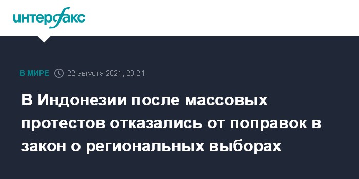 Москва. 22 августа. INTERFAX.RU - Парламент Индонезии отказался от вызвавших массовые протесты планов внести поправки в законодательство о региональных выборах, сообщает в четверг Associated Press.