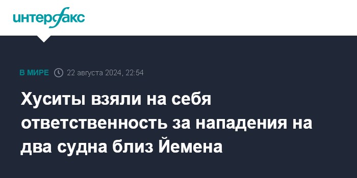 Москва. 22 августа. INTERFAX.RU - Йеменские мятежники-хуситы обстреляли два судна в Красном море и Аденском заливе, заявил представитель хуситов Яхья Сари.