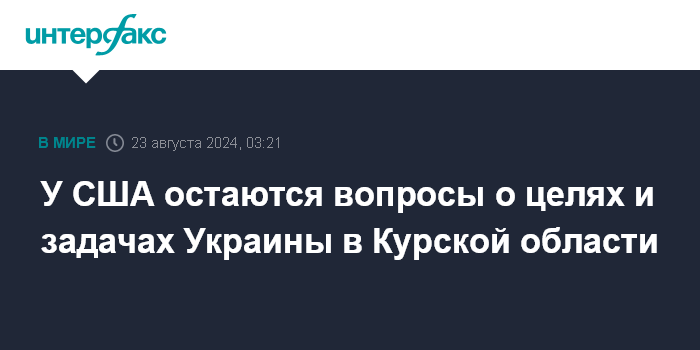 Москва. 23 августа. INTERFAX.RU - У Вашингтона, несмотря на пояснения Киева, остаются вопросы к украинцам относительно целей и задач в Курской области России, сообщила на брифинге представитель Пентагона Сабрина Сингх.