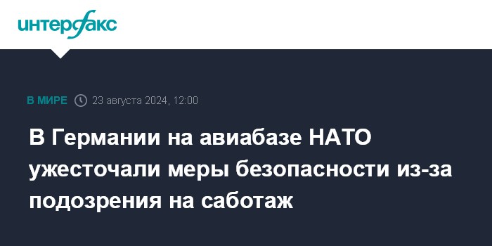 Москва. 23 августа. INTERFAX.RU - В Германии проверка на авиабазе НАТО в Гайленкирхене не выявила следов саботажа, сообщает Spiegel. Ранее на базе ужесточали меры безопасности из-за возможной угрозы.