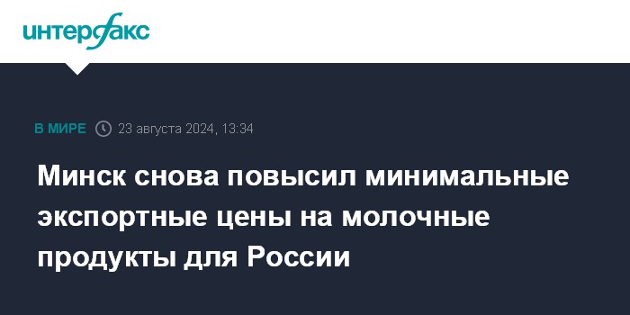 Ранее в 2024 году Минсельхозпрод Белоруссии повышал минимальные цены на молочные продукты на экспорт на российский рынок 1 и 16 августа, 16 и 12 июля, 22 июня, 2 и 12 апреля, а также 8 и 23 марта.