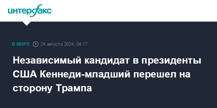 Ранее Кеннеди - независимый кандидат на пост главы государства - объявил, что прекращает предвыборную кампанию и будет поддерживать Трампа. Одной из причин своего решения он назвал то, что Трамп намерен работать над прекращением конфликтов.