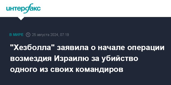 Москва. 25 августа. INTERFAX.RU - Движение "Хезболла" распространило заявление о начале ответных меры на убийство одного из командиров группировки Фуада Шукра в Бейруте в результате удара Армии обороны Израиля (ЦАХАЛ) в июле.
