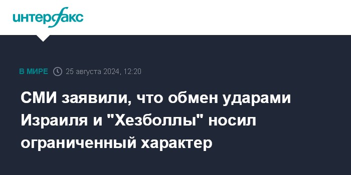 Москва. 25 августа. INTERFAX.RU - Обмен ударами Израиля и движения "Хезболла" в воскресенье не являлся актом полномасштабного конфликта, сообщает издание The National со ссылкой на представителя сферы безопасности одной из арабских стран.