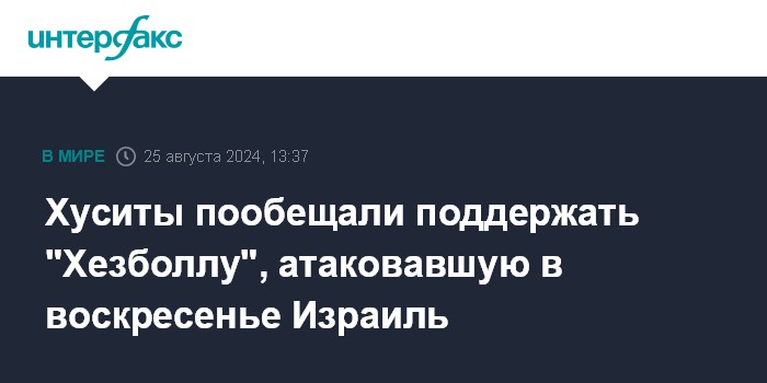 Москва. 25 августа. INTERFAX.RU - Йеменские хуситы в воскресенье приветствовали удар движения "Хезболла" по Израилю и пообещали продолжить действовать в регионе, сообщает издание The National со ссылкой на заявление мятежников.