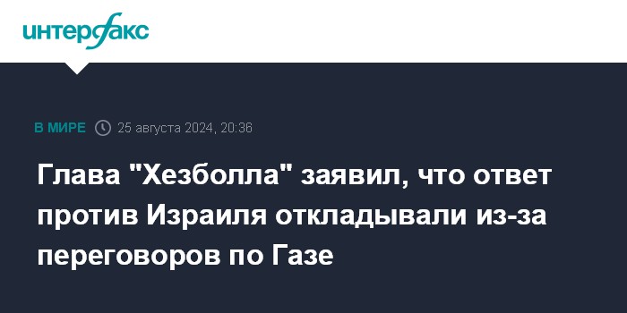 Москва. 25 августа. INTERFAX.RU - В "Хезболле" временили с осуществлением атаки на Израиль в связи с проведением переговоров по урегулированию в секторе Газа, примут решение по новым ударам позднее, заявил лидер движения Хасан Насралла, которого цитирует Press TV.