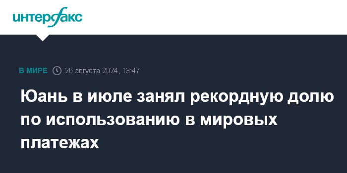 Москва. 26 августа. INTERFAX.RU - Доля юаня в международных расчетах в июле достигла рекордных 4,74%, увеличившись по сравнению с 4,61% в июне. Об этом сообщает Securities Daily со ссылкой на данные расчетной системы SWIFT.