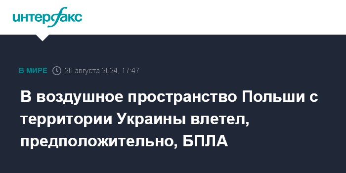 Москва. 26 августа. INTERFAX.RU - Польские военные ищут летательный объект, который 26 августа пересек границу со стороны украинского города Червонограда и углубился в воздушное пространство Польши на 25 км южнее города Грубешува (Люблинское воеводство), сообщает Польское радио.