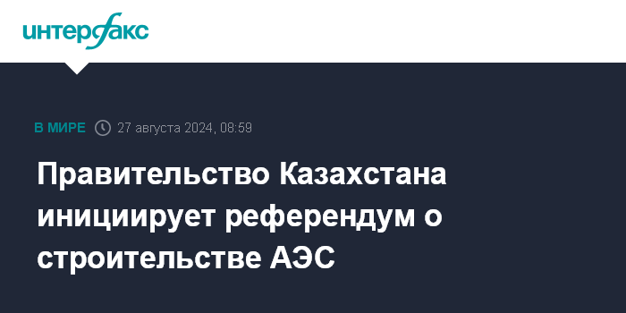 Москва. 27 августа. INTERFAX.RU - Правительство Казахстана приняло постановление об инициировании республиканского референдума по вопросу строительства атомной электростанции в стране, передает корреспондент агентства "Интерфакс-Казахстан".