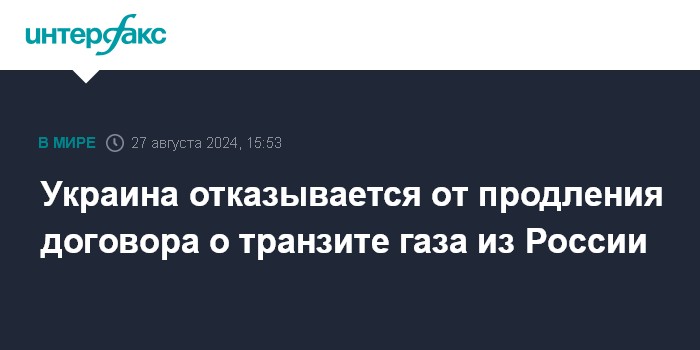 Москва. 27 августа. INTERFAX.RU - Украина не намерена продлевать транзитный договор с Россией по газу, срок действия которого истекает в конце 2024 года, в случае запроса из Европы готова обсуждать транзит газа других поставщиков через свою газотранспортную систему, заявил президент Владимир Зеленский.