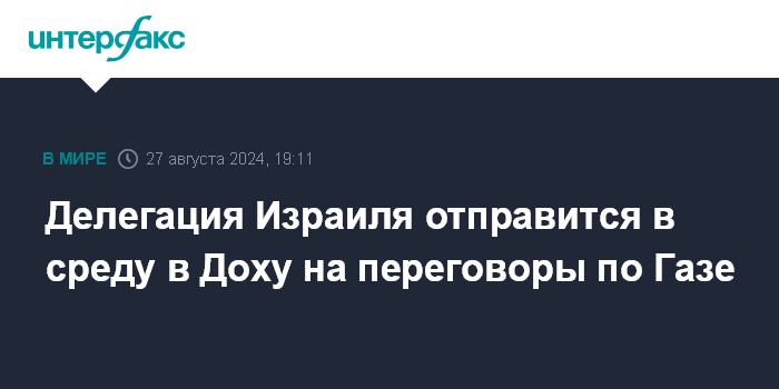 "Израильская делегация (...) поедет в среду в Доху с целью продолжить переговоры с официальными лицами США, Катара и Египта для устранения оставшихся пробелов в сделке по заложникам и прекращению огня в Газе", - написал сотрудник портала Барак Равид в соцсети X.