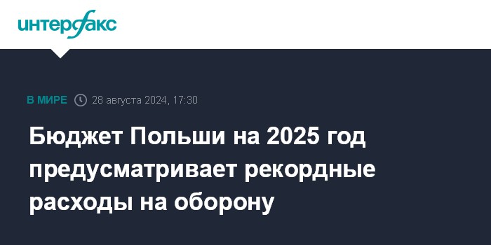 Москва. 28 августа. INTERFAX.RU - Правительство Польши в среду одобрило проект бюджета на 2025 год, которым в частности предусмотрено рекордное увеличение расходов на оборону, сообщают польские СМИ.