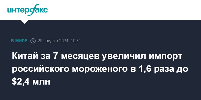 Москва. 29 августа. INTERFAX.RU - Китай в январе-июле 2024 года импортировал из РФ мороженого на $2,368 млн, что в 1,6 раза больше, чем за аналогичный период прошлого года ($1,438 млн). Об этом сообщается в материалах Государственного таможенного управления (ГТУ) КНР.