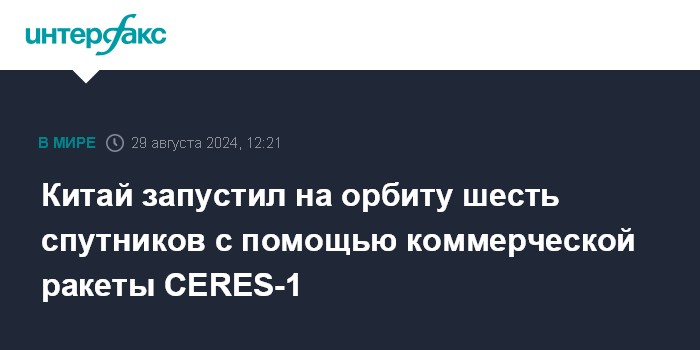 Москва. 29 августа. INTERFAX.RU - Китайская коммерческая ракета-носитель CERES-1 в четверг успешно вывела на орбиту шесть спутников, сообщило издание China Daily.