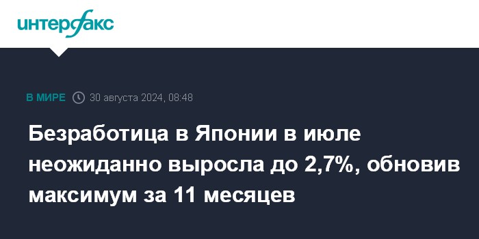 Безработица в Японии в июле неожиданно выросла до 2,7%, обновив максимум за 11 месяцев