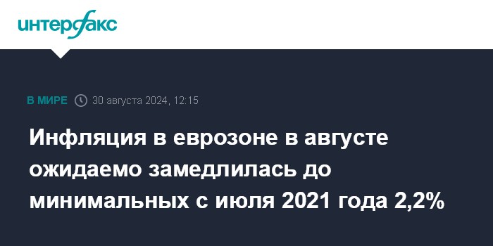 Инфляция в еврозоне в августе ожидаемо замедлилась до минимальных с июля 2021 года 2,2%