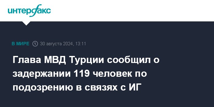 Москва. 30 августа. INTERFAX.RU - Турецкие власти задержали 119 человек, которых подозревают в связях с группировкой "Исламское государство" (ИГ, запрещенная в России террористическая организация), сообщают в пятницу турецкие СМИ со ссылкой на министра внутренних дел страны Али Ерликая.