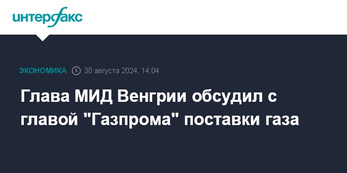 Москва. 30 августа. INTERFAX.RU - Министр иностранных дел Венгрии Петер Сийярто встретился в Петербурге с председателем правления ПАО "Газпром" Алексеем Миллером, они обсудили поставки российского газа в Венгрию. О встрече Сийярто сообщил в соцсети.